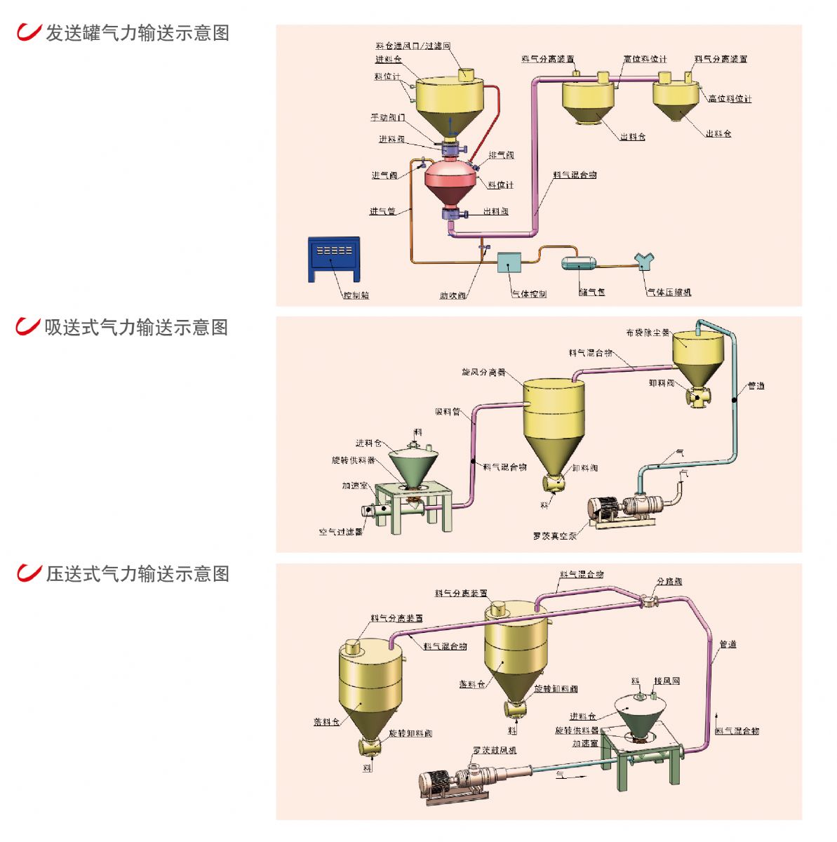 稀相氣力(氣流)輸送系統(tǒng)是利用低于1kg/cm2的氣體壓力,采用正壓(壓送式)或負(fù)壓(吸送式)并以較高的速度來推動或拉動物料使其通過整條輸送線,因此該輸送方式被稱之為低壓高速系統(tǒng),它具有較高的氣體-物料比。