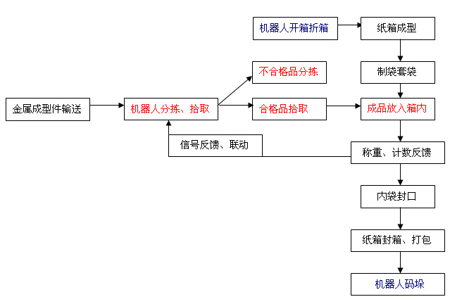 系統概述: 工業機器人應用技術顧名思義,是在以工業機器人為載體的前提下,自主研究、開發機器人在工業領域具體應用的實用型技術。力馬包裝主旨打造工業機器人在包裝、物流行業的技術開發、推廣應用。 如以下流程示意: 紅色字體部分為機器人A作業工序,藍色字體部分為機器人B作業工序: