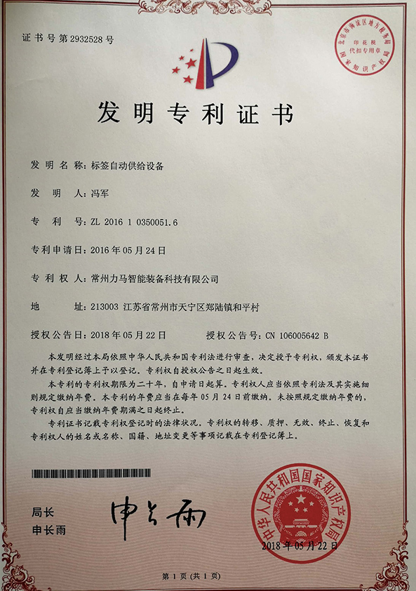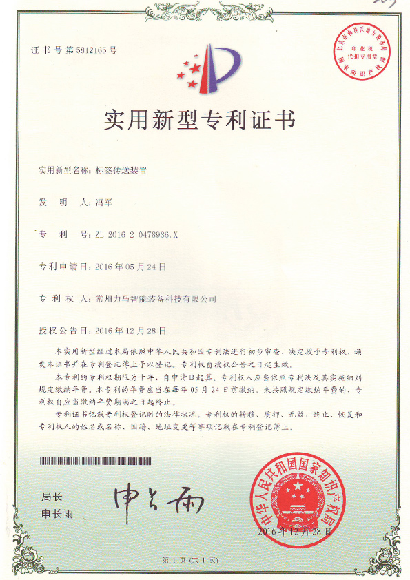 專利證書(標(biāo)簽傳送裝置) |