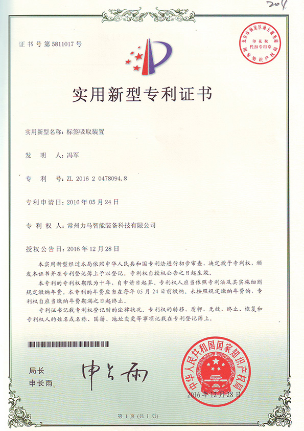 專利證書(標(biāo)簽吸取裝置) |