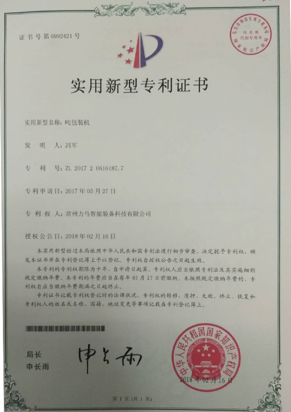 專利證書-噸袋包裝機 |