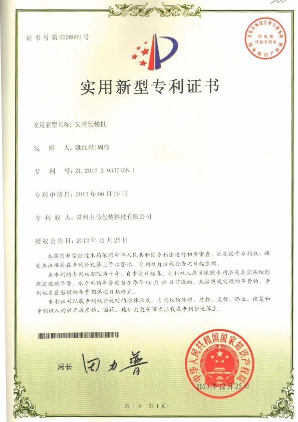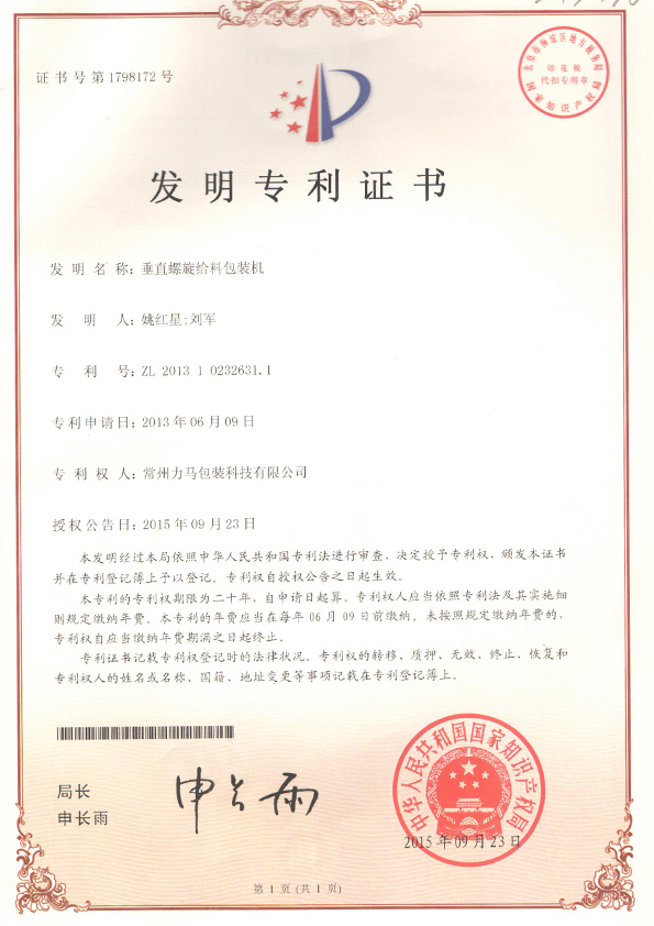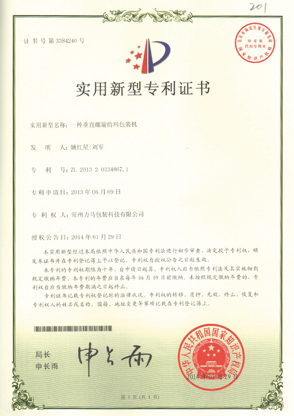 垂直螺旋包裝機專利證書 |