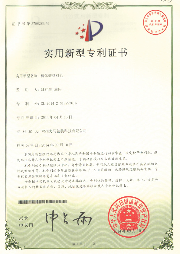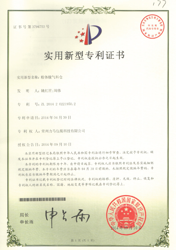 粉體脫氣料倉專利證書 |