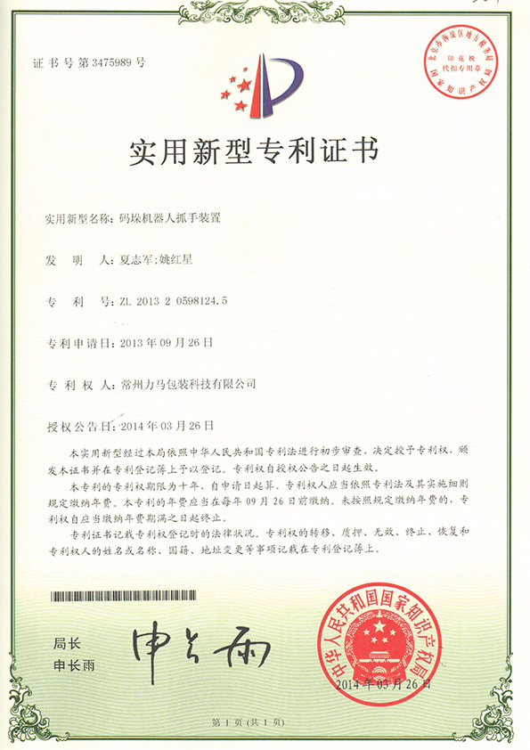 碼垛機器人抓手專利證書 |